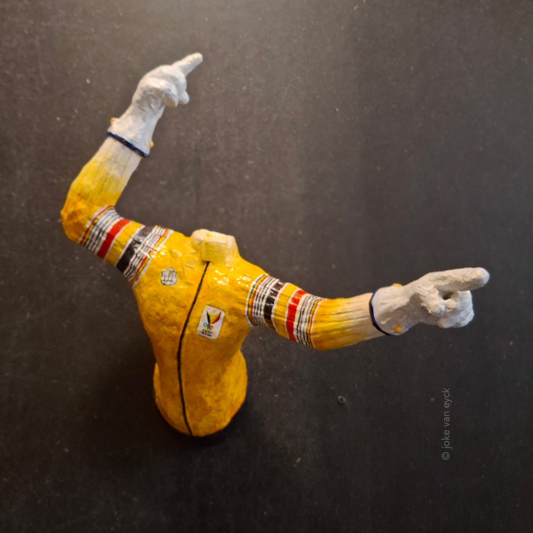 • Torso. Remco Evenepoel cries out for new bike, 2024 Olympics. Recycled paper pulp, painted. Artwork by joke van eyck