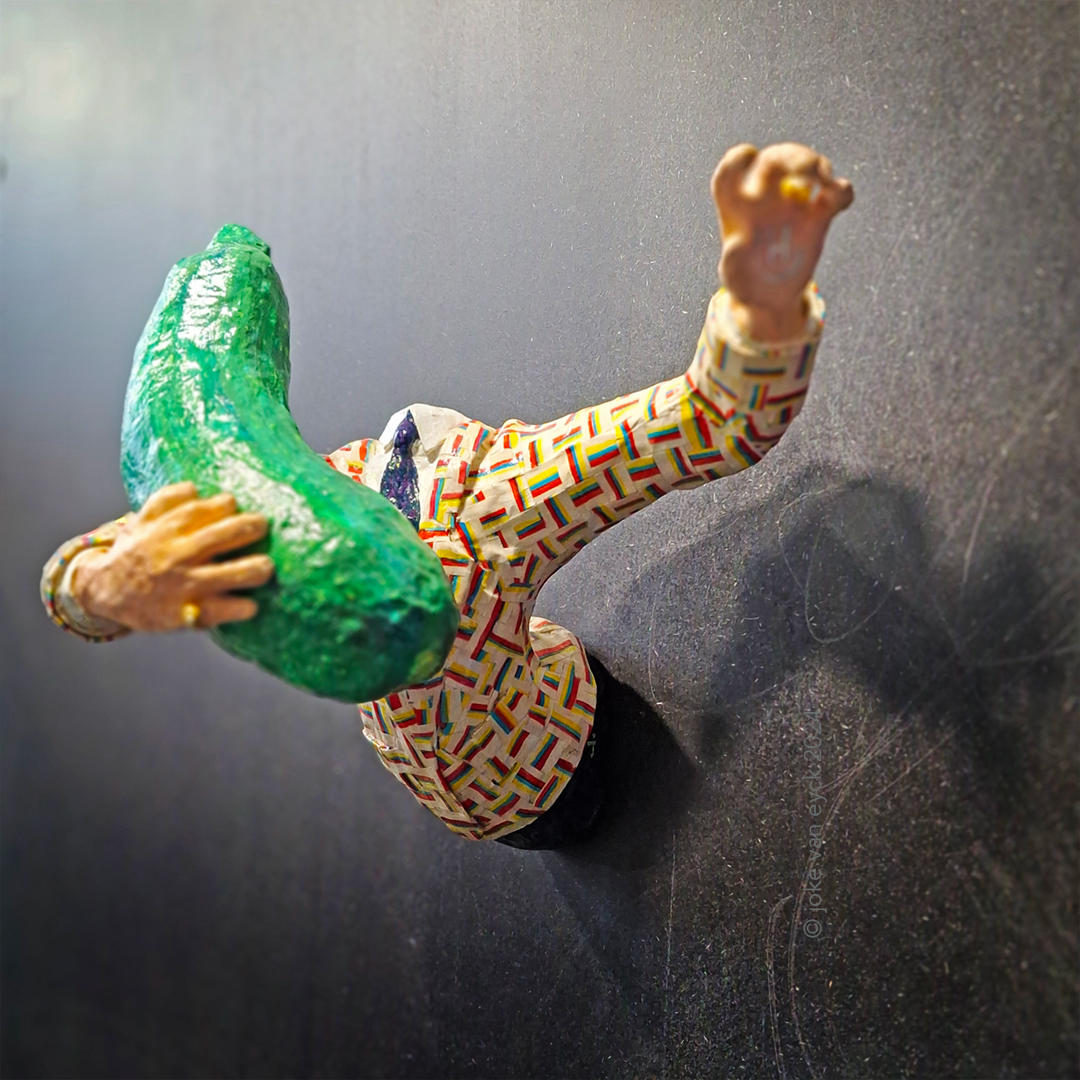 • Painted Sculpture. Torso of armand pien holding a large vegatable. Recycled paper pulp, painted. Artwork by ©joke van eyck 2024