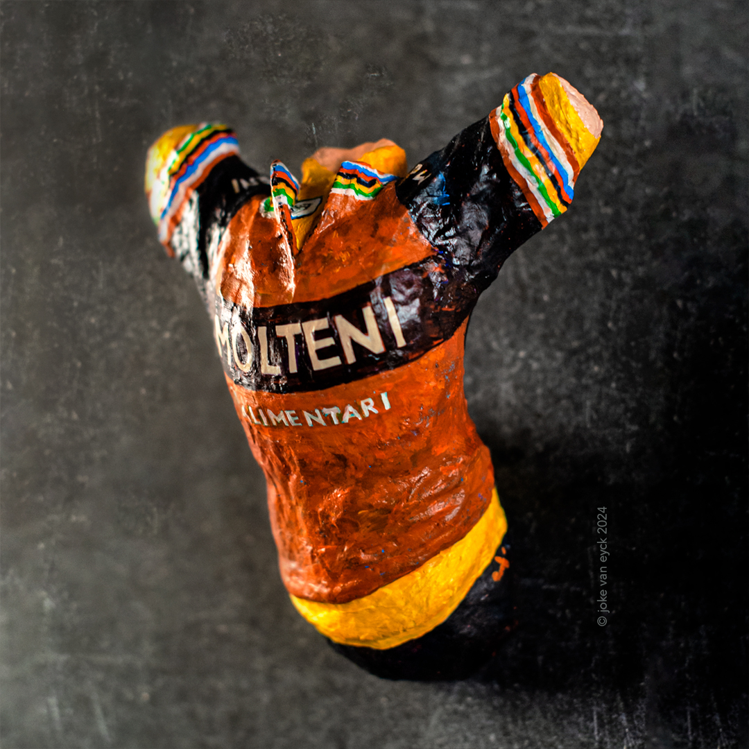 Painted Sculpture. Torso of Eddy Merckx winning Milan-San Remo in 1976, for the 7th time. Recycled paper pulp, painted. Artwork by joke van eyck